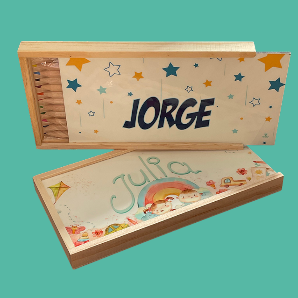 Este bonito estuche de madera natural con tapa personalizable es el regalo perfecto para pequeños artistas, eventos escolares o detalles creativos en celebraciones especiales. Disponible en dos tamaños, incluye 8 o 12 lapiceros de colores y un espacio ideal en la tapa para grabar el nombre del niño, una fecha especial o el mensaje que tú elijas o la fotografía que más te guste